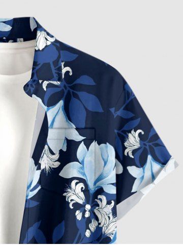 Plus Size Flower Leaf Branch Print Hawaii Button Pocket Shirt For Men - Deep Blue - 4xl
