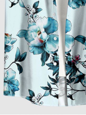 Plus Size Flower Leaf Branch Print Hawaii Button Pocket Shirt For Men - Turquoise - 5xl