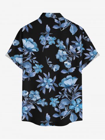 Plus Size Flower Leaf Branch Print Hawaii Button Pocket Shirt For Men - Denim Blue - L