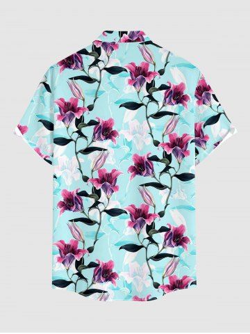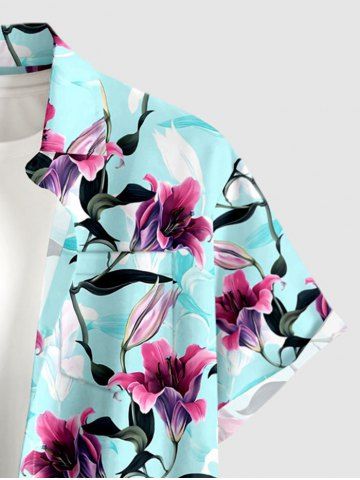 Plus Size Flower Leaf Branch Print Hawaii Button Pocket Shirt For Men - Turquoise - Xl