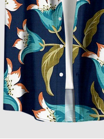Plus Size Flower Leaf Branch Print Hawaii Button Pocket Shirt For Men - Cadetblue - M