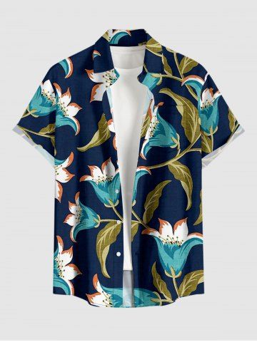 Plus Size Flower Leaf Branch Print Hawaii Button Pocket Shirt For Men - Cadetblue - L
