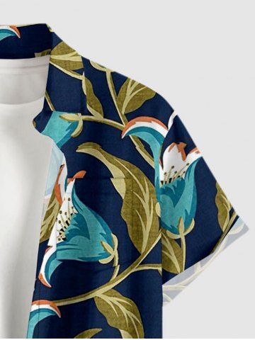 Plus Size Flower Leaf Branch Print Hawaii Button Pocket Shirt For Men - Cadetblue - 4xl