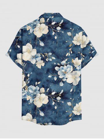 Plus Size Flower Leaf Branch Print Hawaii Button Pocket Shirt For Men - Deep Blue - S