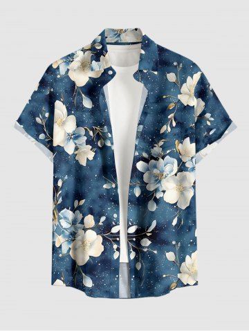Plus Size Flower Leaf Branch Print Hawaii Button Pocket Shirt For Men - Deep Blue - L