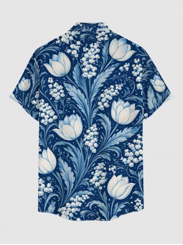 Plus Size Flower Leaf Branch Print Hawaii Button Pocket Shirt For Men - Blue - 4xl