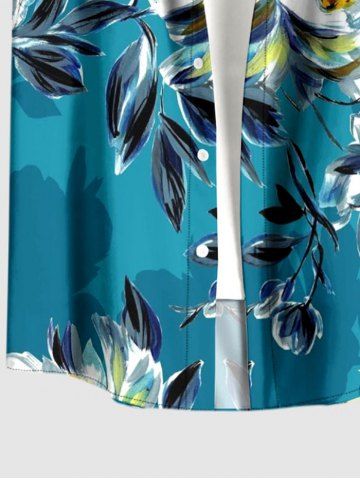Plus Size Flower Leaf Branch Print Hawaii Button Pocket Shirt For Men - Blue - S