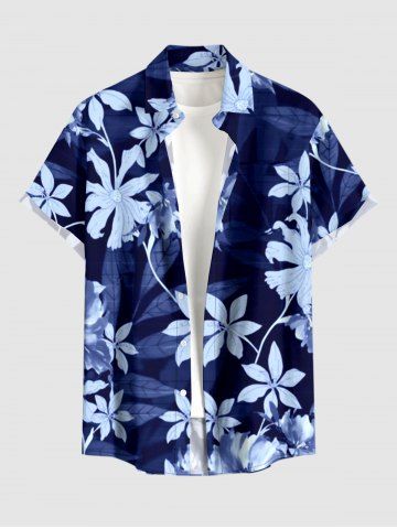 Plus Size Flower Leaf Branch Print Hawaii Button Pocket Shirt For Men - Deep Blue - 2xl