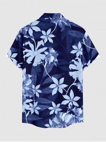 Plus Size Flower Leaf Branch Print Hawaii Button Pocket Shirt For Men - Deep Blue - 4xl