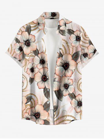 Plus Size Flower Leaf Curve Print Hawaii Button Pocket Shirt For Men - Rose - M