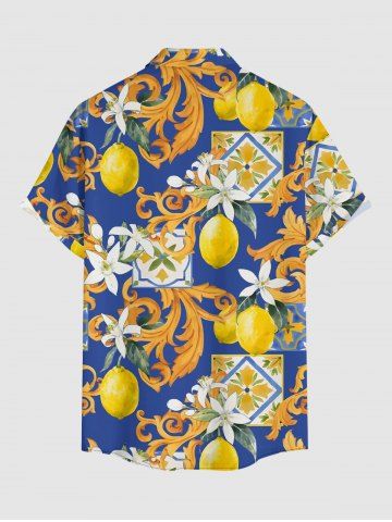 Plus Size Flower Leaf Lemon Print Hawaii Button Pocket Shirt For Men - Blue - M
