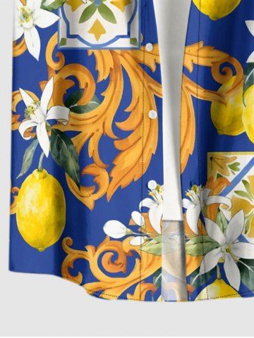 Plus Size Flower Leaf Lemon Print Hawaii Button Pocket Shirt For Men - Blue - L
