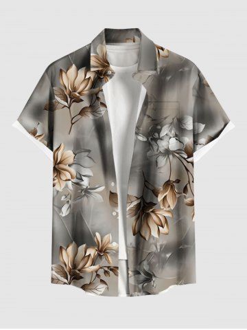 Plus Size Flower Leaf Ombre Print Hawaii Button Pocket Shirt For Men - Light Brown - L