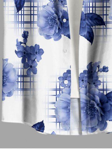 Plus Size Flower Leaf Plaid Print Hawaii Button Pocket Shirt For Men - Blue - S