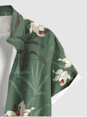 Plus Size Flower Leaf Plant Print Hawaii Button Pocket Shirt For Men - Green - L