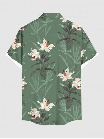 Plus Size Flower Leaf Plant Print Hawaii Button Pocket Shirt For Men - Green - 5xl