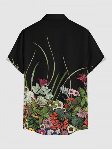 Plus Size Flower Leaf Plant Print Hawaii Button Pocket Shirt For Men - Black - M