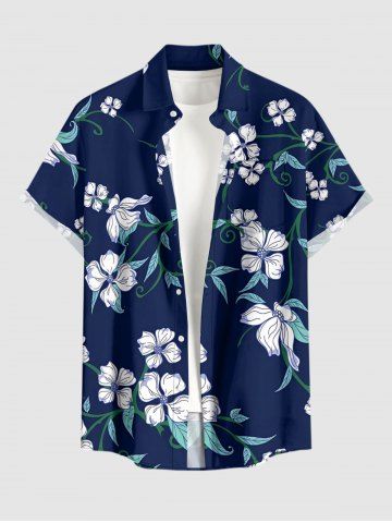 Plus Size Flower Leaf Print Buttons Pocket Hawaii Shirt For Men - Deep Blue - L