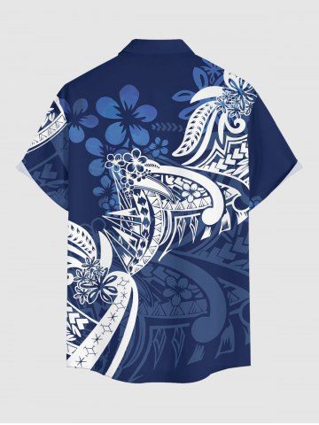 Plus Size Flower Leaf Print Buttons Pocket Hawaii Shirt For Men - Deep Blue - S