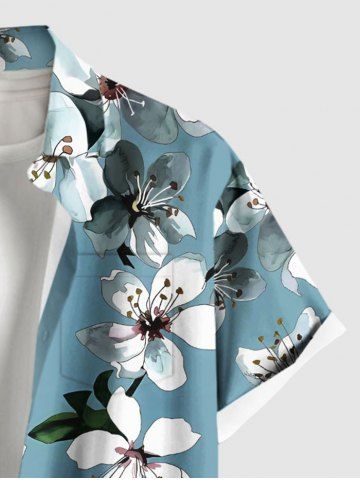 Plus Size Flower Leaf Print Hawaii Button Pocket Shirt For Men - Blue Gray - M