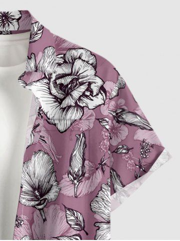 Plus Size Flower Leaf Print Hawaii Button Pocket Shirt For Men - Light Purple - M