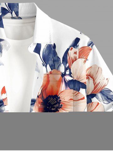 Plus Size Flower Leaf Print Hawaii Button Pocket Shirt For Men - White - S