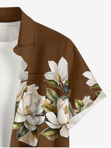 Plus Size Flower Leaf Print Hawaii Button Pocket Shirt For Men - Brown - Xl