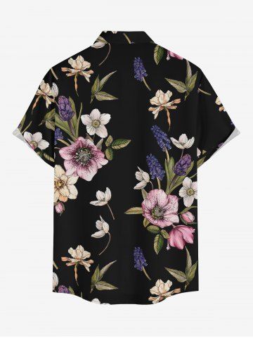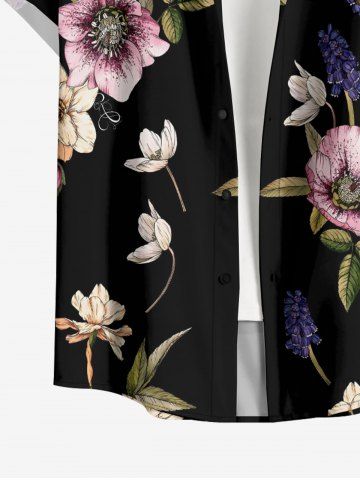 Plus Size Flower Leaf Print Hawaii Button Pocket Shirt For Men - Black - 3xl