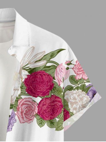 Plus Size Flower Leaf Print Hawaii Button Pocket Shirt For Men - White - M