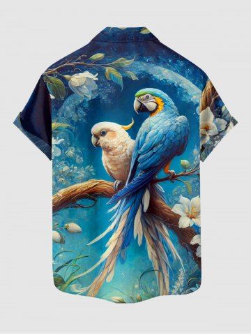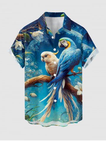 Plus Size Flower Parrot Tree Branch Print Hawaii Button Pocket Shirt For Men - Deep Blue - S