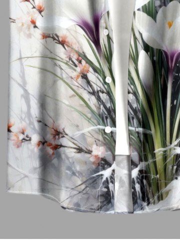 Plus Size Flower Plant Branch Print Hawaii Button Pocket Shirt For Men - White - L