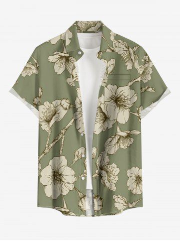 Plus Size Flower Print Hawaii Button Pocket Shirt For Men - Light Green - M