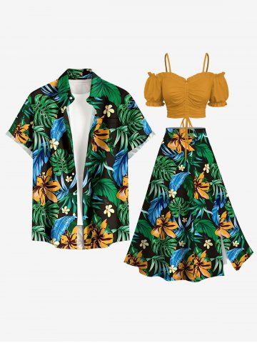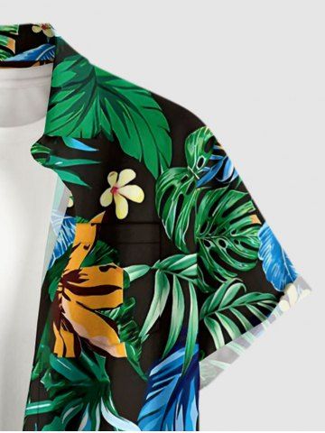 Plus Size Flower Tropical Leaf Print Buttons Pocket Hawaii Shirt For Men - Deep Green - S