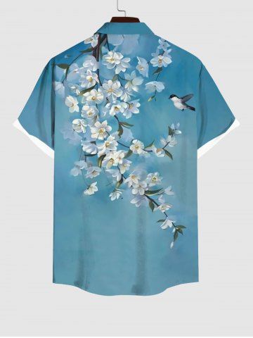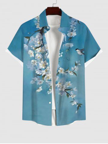 Plus Size Flowers Branch Swallow Print Buttons Pocket Shirt For Men - Blue - 2xl