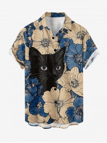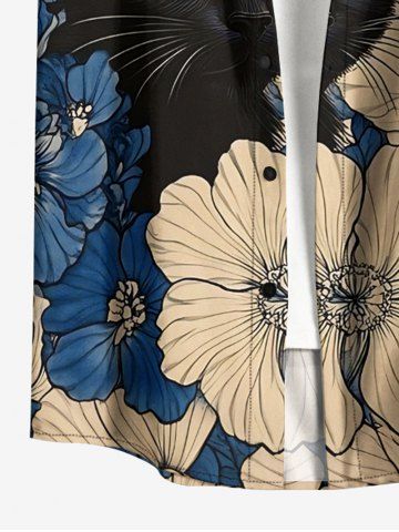 Plus Size Flowers Cat Print Buttons Pocket Hawaii Shirt For Men - Blue - Xl