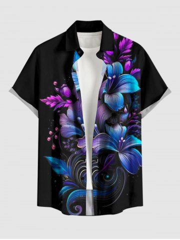 Plus Size Flowers Leaf Ombre Print Buttons Pocket Hawaii Shirt For Men - Black - L