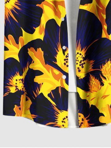 Plus Size Flowers Leaf Print Buttons Pocket Hawaii Shirt For Men - Yellow - S