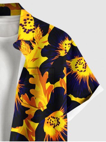 Plus Size Flowers Leaf Print Buttons Pocket Hawaii Shirt For Men - Yellow - 3xl