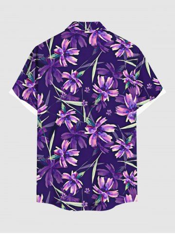 Plus Size Flowers Leaf Print Buttons Pocket Hawaii Shirt For Men - Purple - L