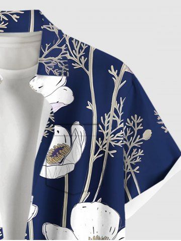 Plus Size Flowers Leaf Print Buttons Pocket Hawaii Shirt For Men - Navy Blue - M