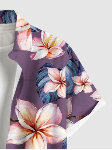 Plus Size Flowers Leaf Print Buttons Pocket Hawaii Shirt For Men - Purple - M