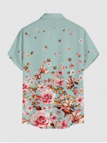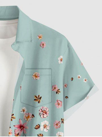 Plus Size Flowers Leaf Print Buttons Pocket Hawaii Shirt For Men - Turquoise - M