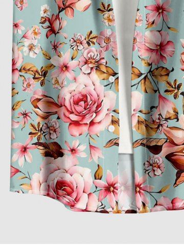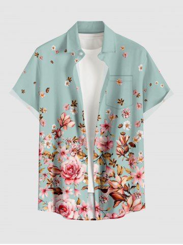 Plus Size Flowers Leaf Print Buttons Pocket Hawaii Shirt For Men - Turquoise - 6xl