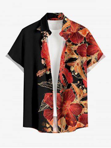 Plus Size Flowers Leaf Print Buttons Pocket Hawaii Shirt For Men - Black - 3xl