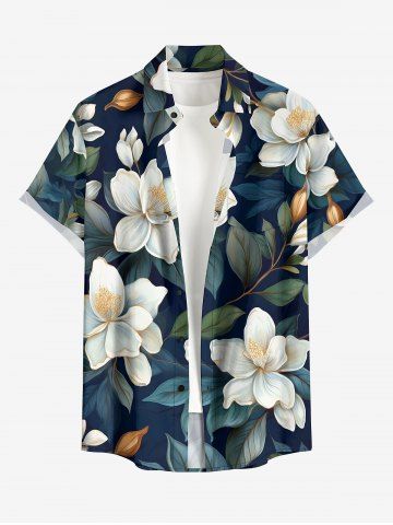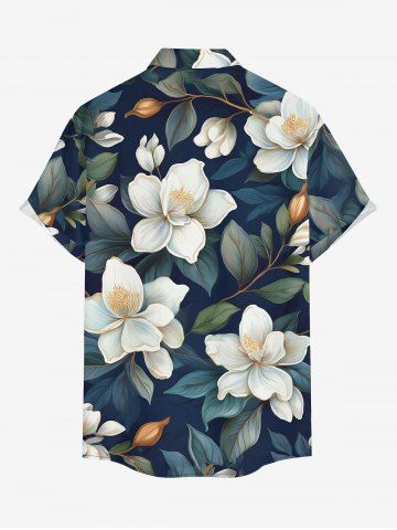 Plus Size Flowers Leaf Print Buttons Pocket Hawaii Shirt For Men - Midnight Blue - S