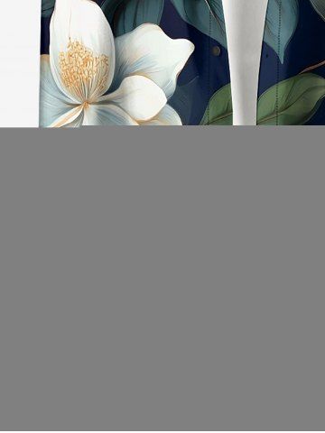 Plus Size Flowers Leaf Print Buttons Pocket Hawaii Shirt For Men - Midnight Blue - L