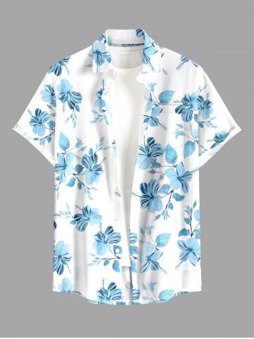 Plus Size Flowers Leaf Print Buttons Pocket Hawaii Shirt For Men - Light Blue - 5xl