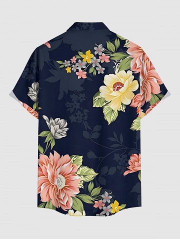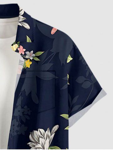Plus Size Flowers Leaf Print Buttons Pocket Hawaii Shirt For Men - Deep Blue - S