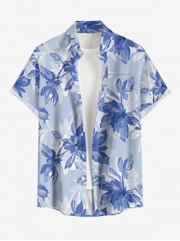 Plus Size Flowers Leaf Print Buttons Pocket Hawaii Shirt For Men - Sky Blue - S
