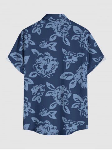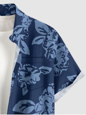 Plus Size Flowers Leaf Print Buttons Pocket Hawaii Shirt For Men - Deep Blue - M